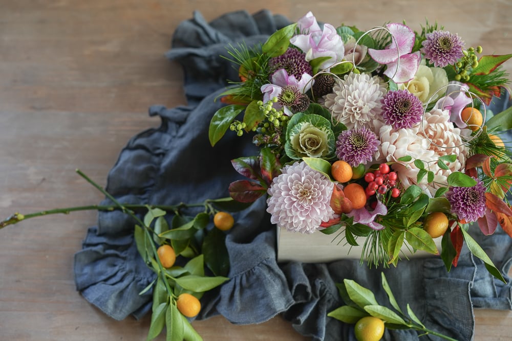今年はボックスタイプのアレンジメントもご案内。瑞々しくとても華やかです。ご自宅用に、プレゼントにも。新年のスタートを明るく、華やかに飾りましょう。