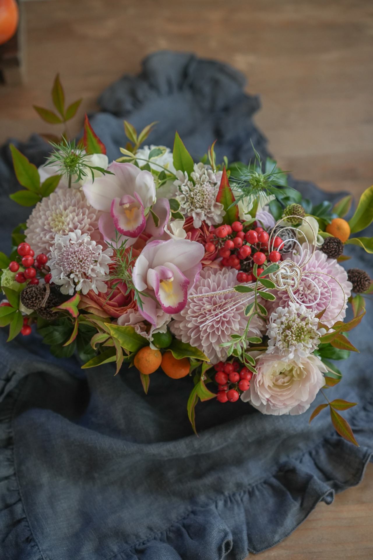美しい洋マムとからげ松、南天、金柑を横長花器にアレンジしたお正月アレンジメント。